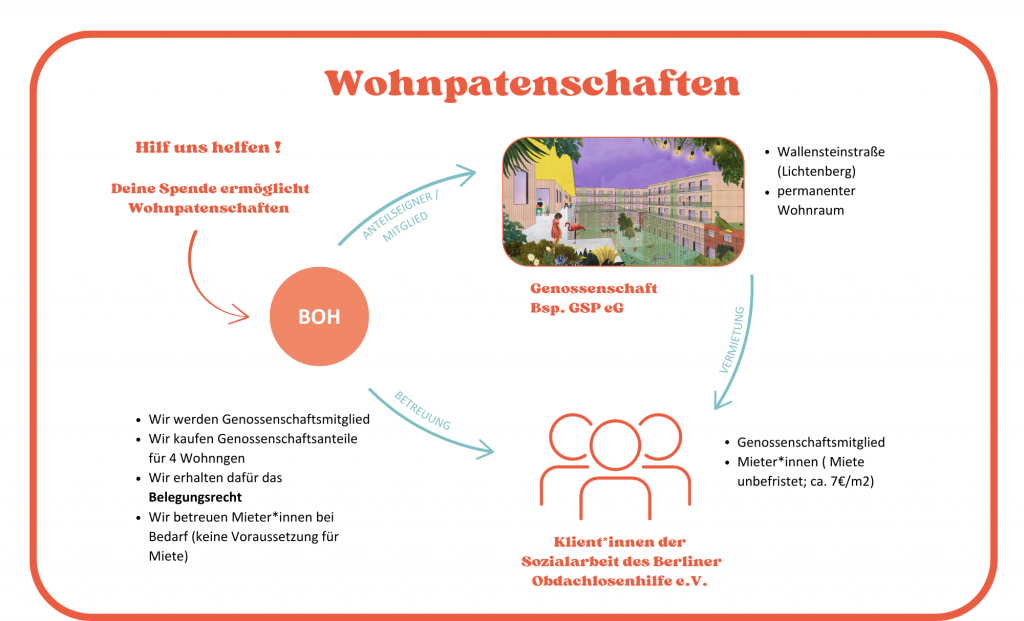 Wir wollen Wohnpat*innen werden und Genossenschaftsanteile erwerben. Damit sichern wir uns das Belegungsrecht für Wohnungen, die wir gezielt an Menschen aus unserem Klient*innen–Kreis vermitteln. Die Mieter*innen schließen einen regulären Mietvertrag ab und übernehmen selbst die Verantwortung für ihren Wohnraum – wir stellen lediglich die Wohnung sicher.